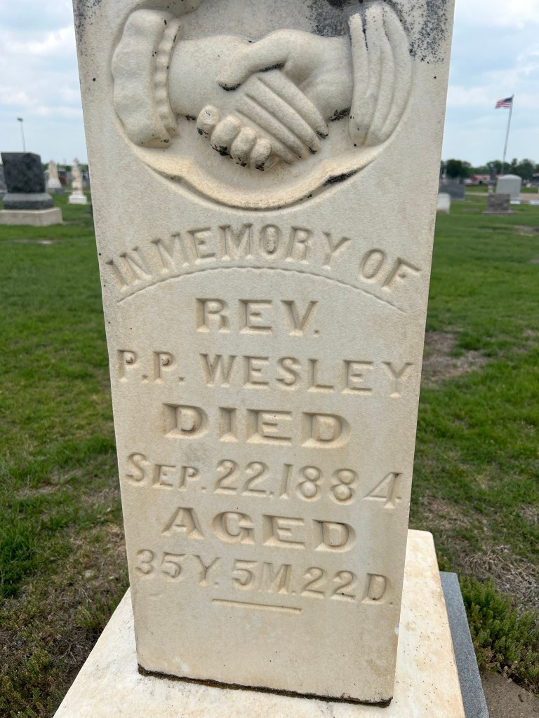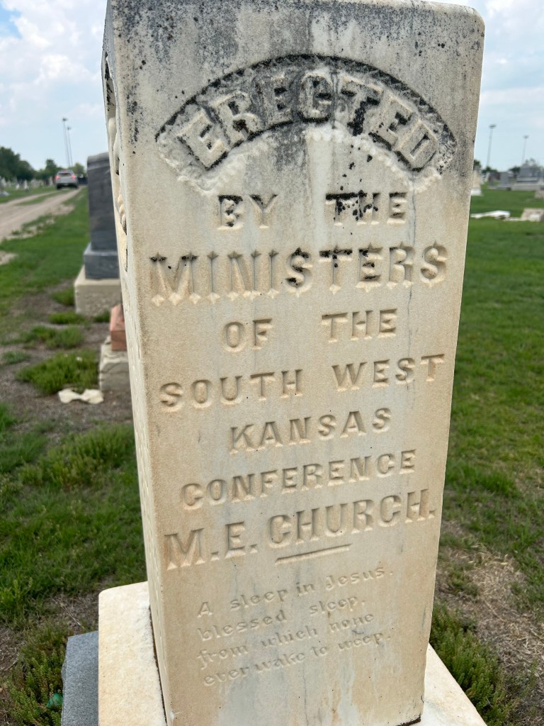 It being Memorial Day, we were in town to visit and put flowers on the graves of my grandfather, uncle, and great-grandparents. The Great Bend cemetery has an old section, populated with grave stones dating back into the 1870s, when the town was founded. I took some pictures and wandered about, but I was especially struck by this tall stone pillar memorializing a deceased Methodist minister, erected by his fellow circuit riders. There must be some story behind this one.