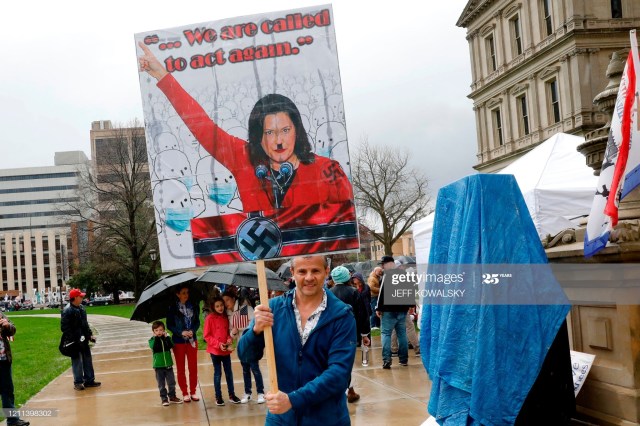TOPSHOT – A protestor with a sign that has Michigan Gov. Gretchen Whittmer depicted as Adolph Hitler is seen at an American Patriot Rally organized by Michigan United for Liberty protest for the reopening of businesses, on the steps of the Michigan State Capitol in Lansing, Michigan on April 30, 2020. – The group is upset with Michigan Gov. Gretchen Whitmer’s mandatory closure to curtail Covid-19. (Photo by JEFF KOWALSKY / AFP) (Photo by JEFF KOWALSKY/AFP via Getty Images)